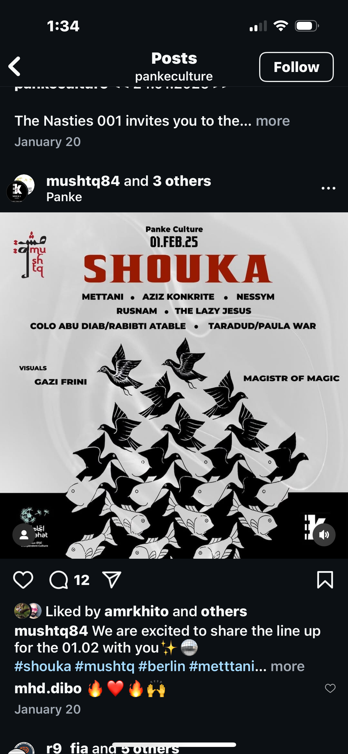 I designed promotional visuals for two Mushtaq events, “Shouka” and “Jibril,” held at Panke Culture in Berlin. The work combined Arabic and Latin typography with bold, culturally symbolic visuals to reflect the events' experimental and diasporic music themes. The design draws on transformation, rhythm, and visual poetry, blending elements like Escher-inspired transitions and retro digital patterns.